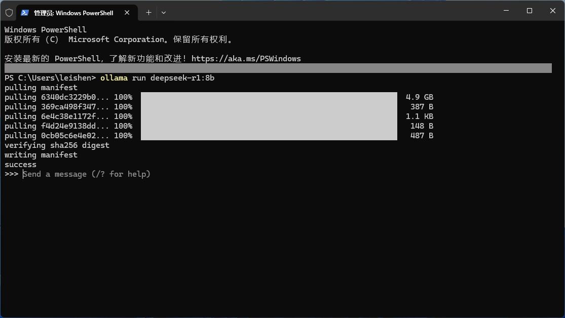 2、ollama安装deepseek-r1:8b,以管理员模式powershell下运行命令如下: