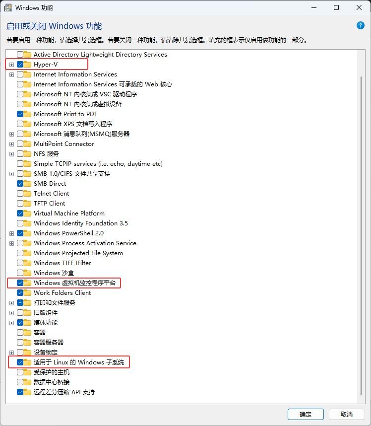 3、Windows 11控制面板:开启hyper-v、windows 虚拟机监控程序平台和适用于Linux的Windows子系统,并重新启动添加成功。