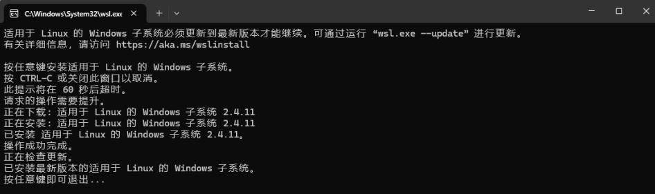 重启后开始弹出安装Linux的windows 子系统,进行安装Linux系统。文档地址:https://learn.microsoft.com/zh-cn/windows/wsl/