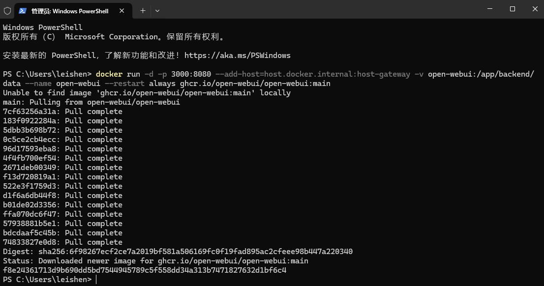 5、docker安装open-webui,以管理员模式powershel运行命令如下: