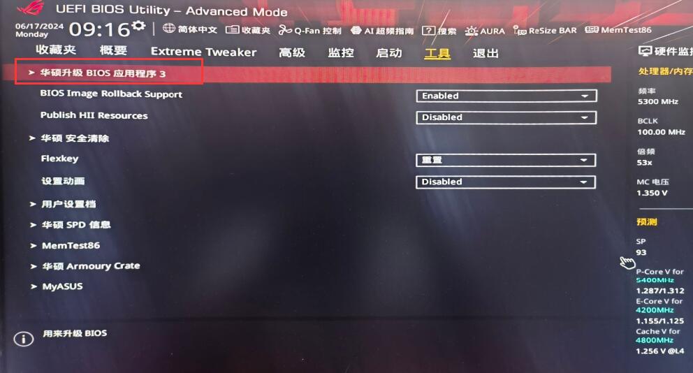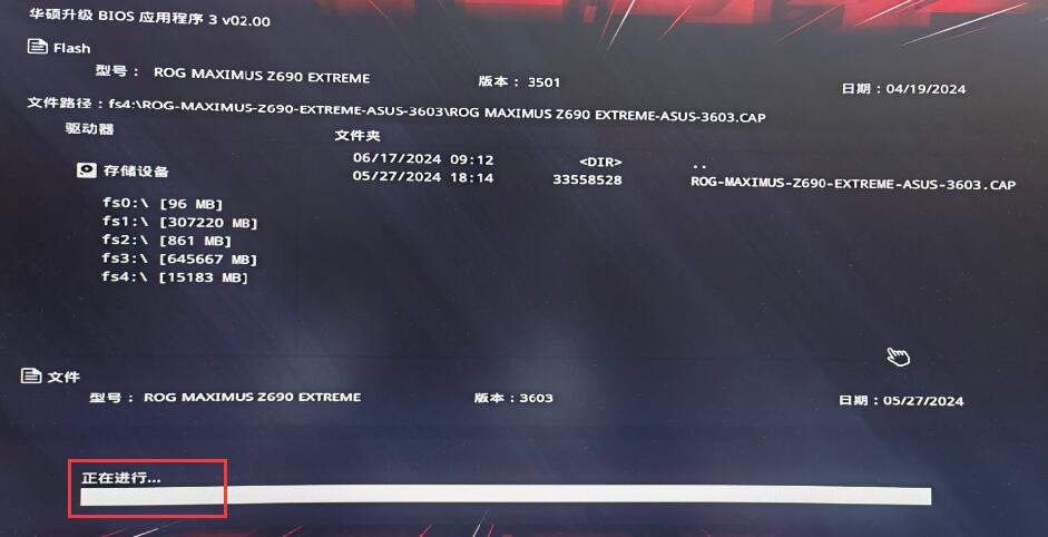F2或DEL进去BIOS,【工具】【华硕升级BIOS应用程序3】选择U盘里面的BIOS程序【ROG MAXIMUS Z690 EXTREME BIOS 3603】回车确认,开始进行升级BIOS,升级完成后提示OK会自动重启,主机重启后,继续自动升级LED固件,完成后进行自动重启,固件升级成功。