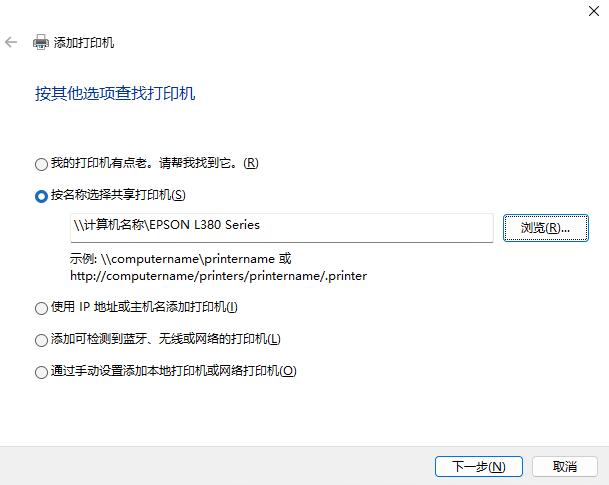 2.【打印机和扫描仪】→ 【添加设备】大约在中间行出现提示:我需要的打印机不在列表中【手动添加】→【按名称选择共享打印机】→【浏览】→选择【目标计算机】后输入用户名和密码,打开后【EPSON L380 Series】选择打开,开始安装打印机驱动,提示:已成功添加,完成局域网打印机添加。