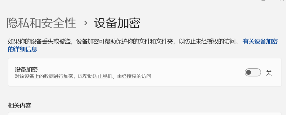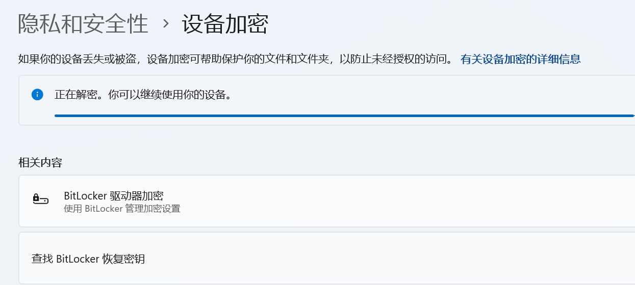 Windows 11 C盘有感叹号但是未启用BitLocker加密解决方法 开心电脑网 • 2024年10月20日 • 网络维护 • 阅读 1646 Windows 11 C盘有感叹号但是未启用BitLocker加密解决方法: 设置→隐私和安全性→设备加密→关闭 设备加密 即可 原创文章,作者:开心电脑网,如若转载,请注明出处。 赞 (1) 0 生成海报 关于作者 开心电脑网 办公电脑技术分享平台 三星SA系列显示器无信号故障解决方案[附三星显示器软件更新软件免费下载] 上一篇 2024年9月2日 Windows配置Vlmcsd自启动搭建KMS服务器,提供激活服务教程 下一篇 2024年10月23日 相关推荐 网络维护 Windows 10 Version 1903 的 05 累积更新KB4497936错误,手动只需二步解决方法 2019年5月20日 11.1K 网络维护 远程桌面登陆提示之前用于连接到的凭据无法工作,请输入新凭据的几种解决方法 2025年2月8日 4.2K 网络维护 Microsoft 365(Office)官方部署下载工具 2020年4月26日 6.1K 网络维护 技嘉主板/显卡/笔记本/主机/键盘/鼠标如何识别产品SN查看生产周期 2022年5月3日 4.5K 网络维护 Surface Book通过组合键调整屏幕亮度 2020年2月14日 4.9K 发表回复 您的邮箱地址不会被公开。 必填项已用 * 标注昵称: 邮箱: 网址: 记住昵称、邮箱和网址,下次评论免输入 提交 Δ