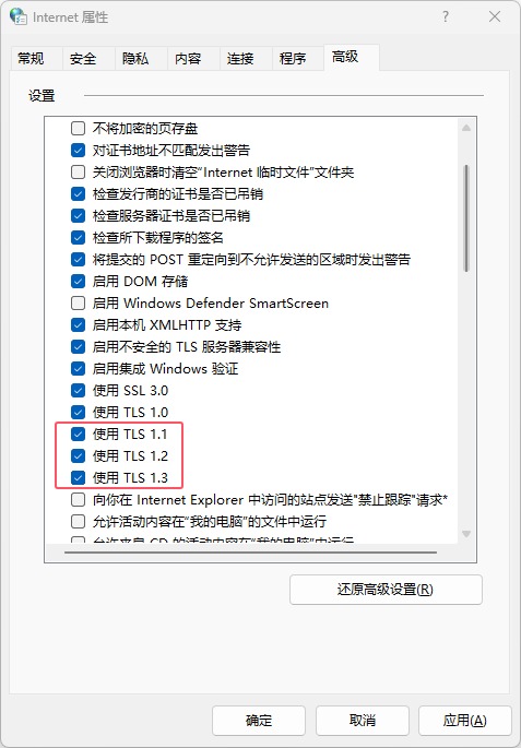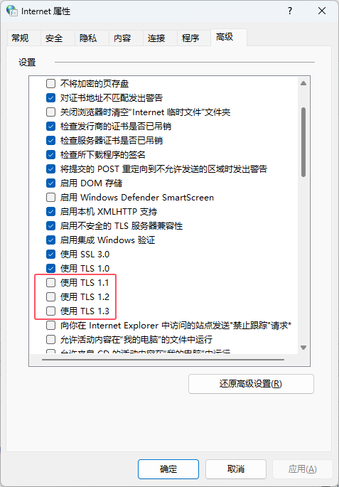 Internet属性→高级→将未勾选上的TLS1.1、1.2、1.3全部勾选上→确定,即可解决。