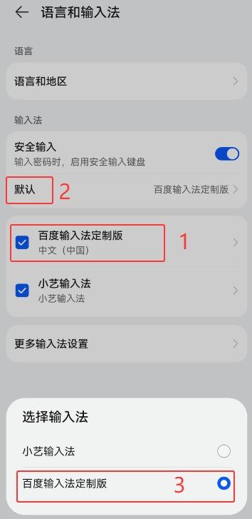 5、迁移成功后,mate60pro→【设置】→【系统和更新】→【语言和输入法】→勾选【百度输入法定制版】→默认选择【百度输入法定制版】