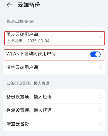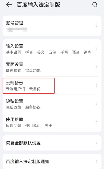 6、登陆百度输入法定制版 账户→选择输入法界面的左上角【四角框】→下拉选择【更多设置】→【云端备份】→【同步云端用户词】进行同步成功即可完成词库同步→同时勾选【wlan下自动同步用户词】