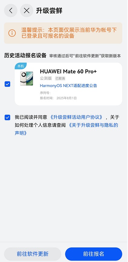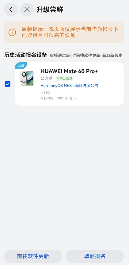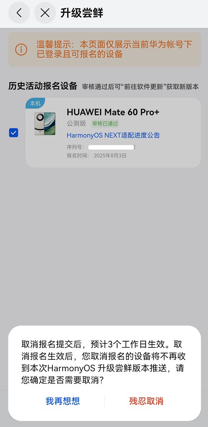 【我的华为】app→【升级尝鲜】→【取消报名】→【残忍取消】→取消成功。