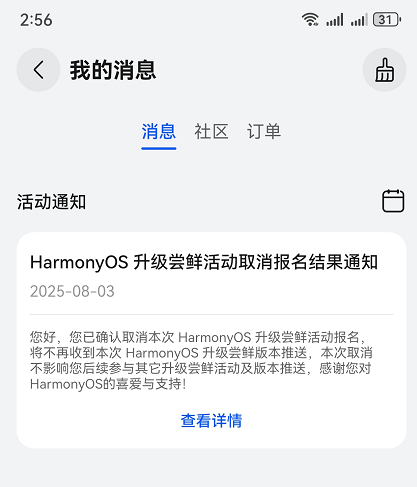 基本上1天左右,【我的华为】app→【我的】→【我的消息】通知:harmonyos 升级尝鲜活动取消报名结果通知,说明取消成功,不会再收到升级尝鲜鸿蒙5.1版本推送。