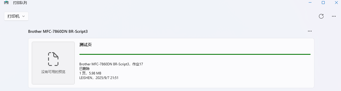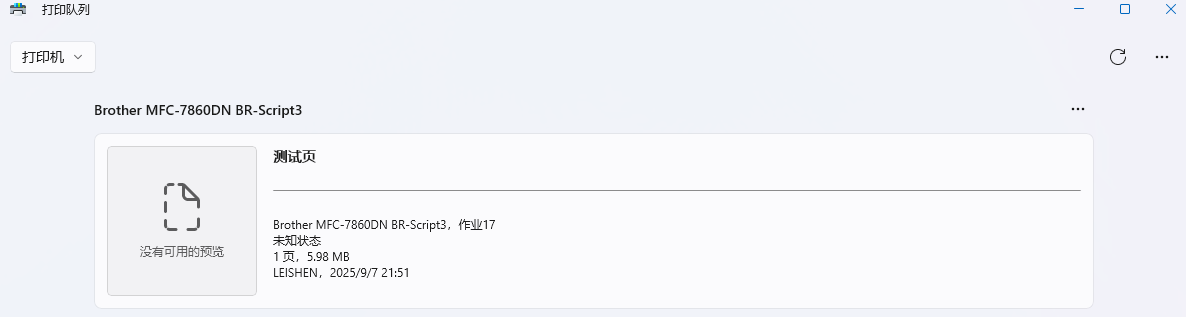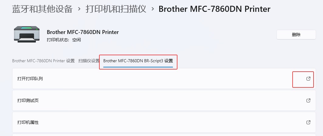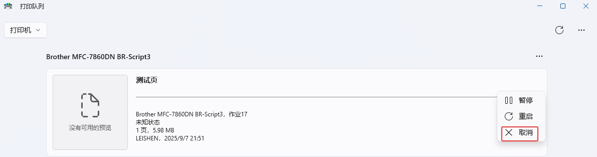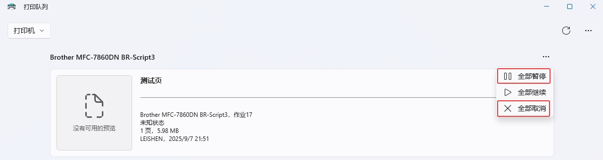 在Windows 11系统下打开打印机,找到Brother MFC-7860DN Printer,找到Brother MFC-7860DN BR-Script3设置→【打开打印队列】→找到【打印队列】→打印内容右键【暂停】继续【取消】,如果打印几份文档,在【打印队列】右上角【全部暂停】继续【全部取消】