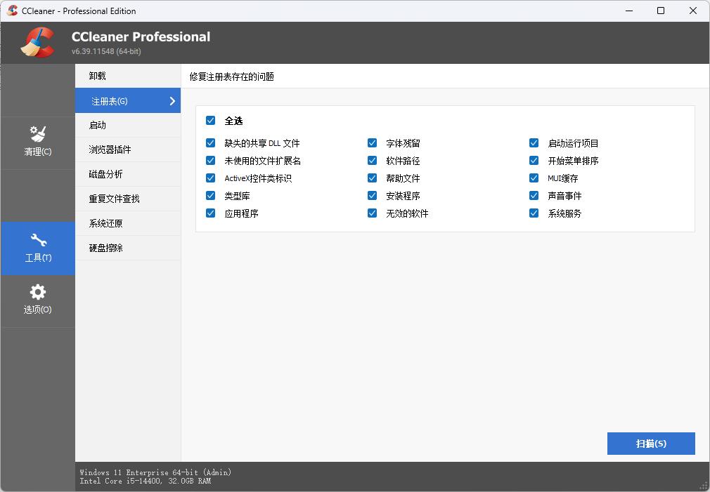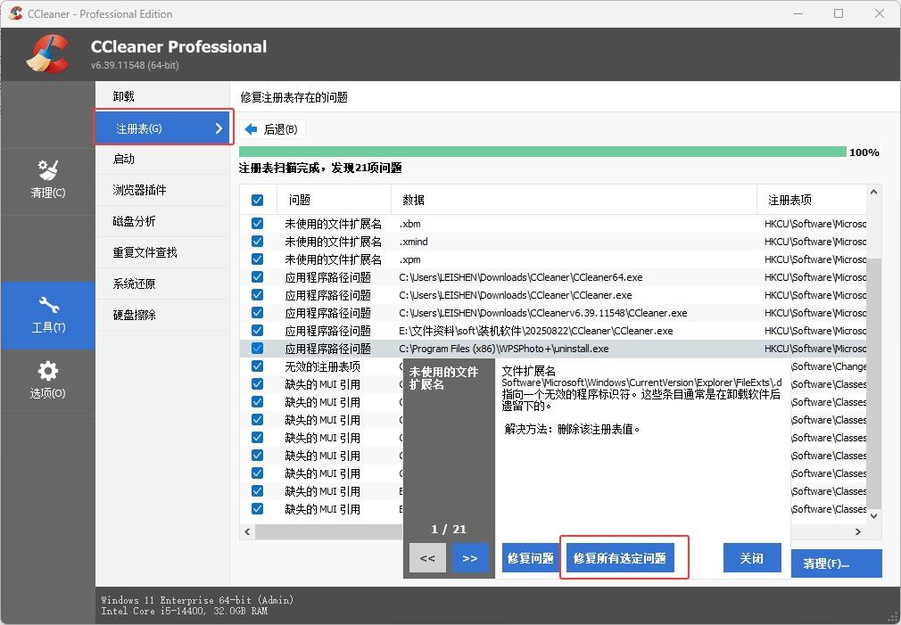 2、打开CCleaner注册表清理软件,【工具】→【注册表】→【扫描】→【清理】→【修复所有选定问题】即可解决。