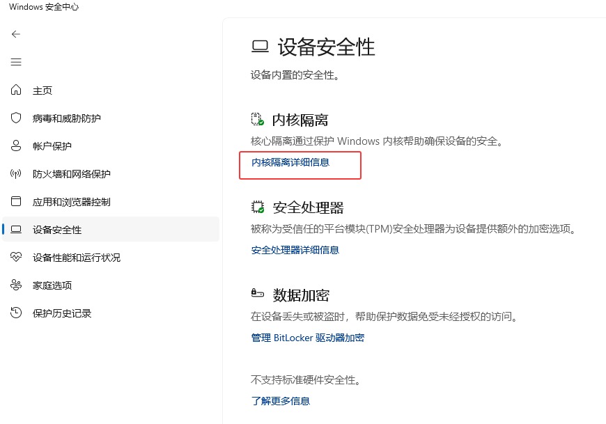 - 还可以打开“核心隔离”页,方法是选择“开始 > 设置 > 隐私 & 安全 > Windows 安全中心 > 设备安全性”,然后在“核心隔离”下选择“核心隔离详细信息”。