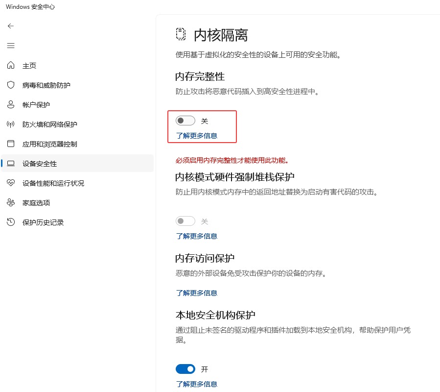 - 如果尚未关闭 内存完整性 设置,请 将其关闭 。 你需要重启计算机,这些更改才能生效。