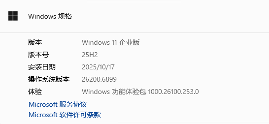 5、通过虚拟机进行安装,里面没有显示选择版本,按照正常安装流程进行,安装完,通过系统信息看到Windows 规格:Windows 11企业版25H2