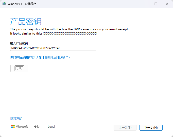 3、Windows 11 安装程序界面,输入企业版的产品密钥如下:在进行下一步