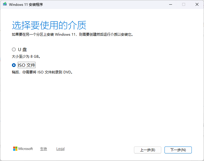 4、Windows 11 安装程序界面,选择要使用的介质,根据实际需求,U盘或者刻录成ISO文件,本站长以ISO文件为例,选择后下一步,选择存储路径确认后,开始下载,生成的镜像文件为Windows.iso