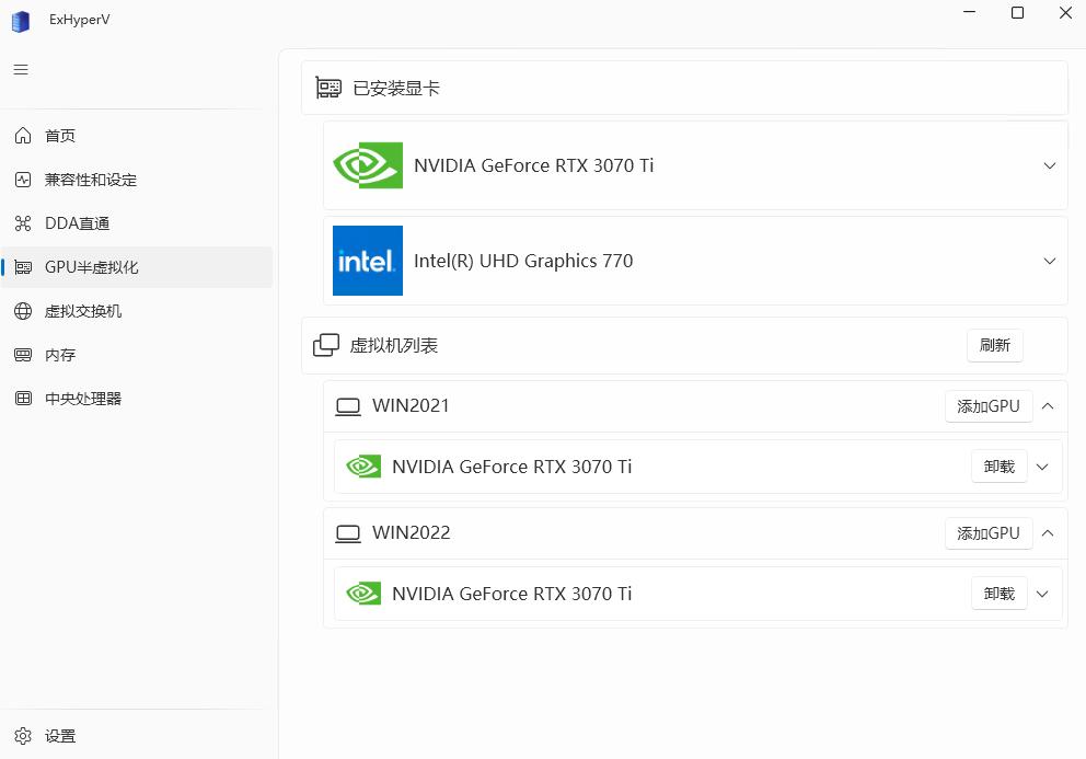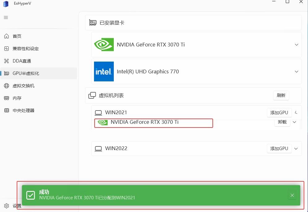 https://builds.dotnet.microsoft.com/dotnet/WindowsDesktop/8.0.23/windowsdesktop-runtime-8.0.23-win-x64.exe【GPU半虚拟化】→虚拟机列表 例如WIN2021 →【添加GPU】→【GPU选择】选择独立显卡 例如3070Ti→【确定】→【驱动注入】例如 partition 3 (126.33Gb)-Windows→【确定】→提示:成功 已分配到WIN2021