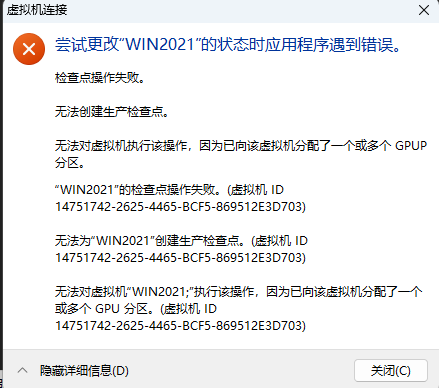 不禁用检查点,会导致显卡写入到虚拟机后无法正常启动提示报错。以下为报错提示: