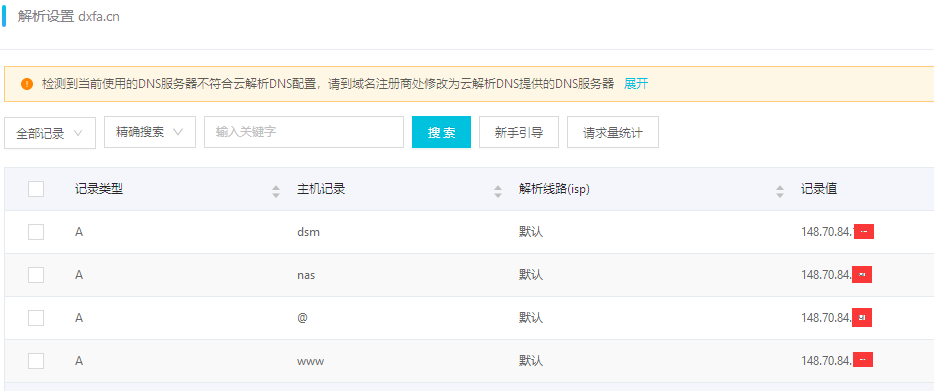 1.首先在阿里云控制台-域名(选中域名打开)-DNS修改如下: