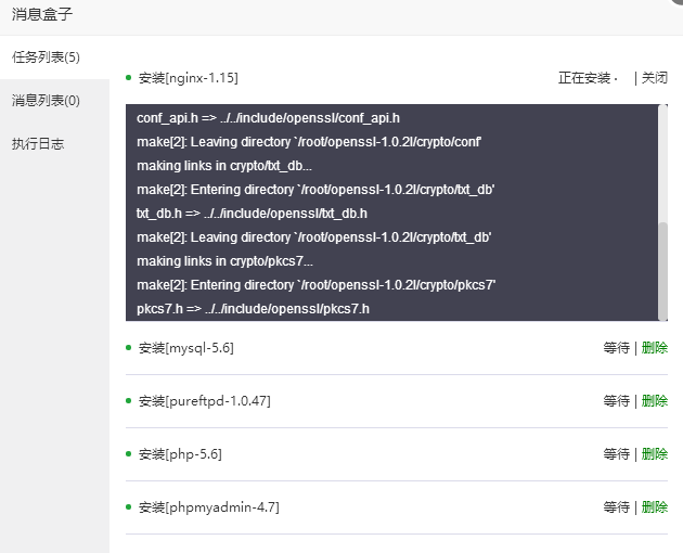 登陆宝塔面板后,默认nginx的推荐套件,建议:安装的版本:nginx 1.15,mysql 5.6,php 5.6, phpmyadmin 4.7,直接安装即可。