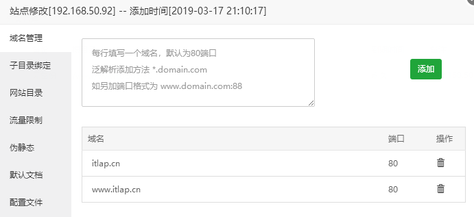 登陆宝塔面板,修改站点,设置-域名管理增加 itlap.cn和www.itlap.cn 添加保存如下:
