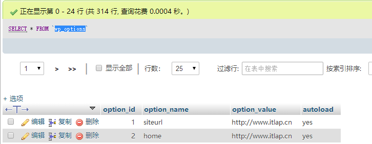 登陆phpmyadmin修改wp_options选项的siteurl和home为http://www.itlap.cn 如下: