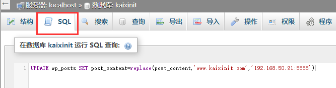 5.迁移网站更改域名解决图片无法显示,在phpmyadmin选择kaixinit数据表,sql执行:即可批量完成替换图片url地址。