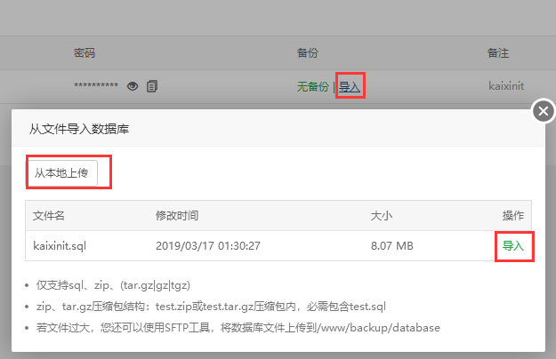 在数据库控制台添加一个数据库名,尽量和原备份的表名一致,(myslq数据库版本5.6必须备份和恢复的版本一致,不然会出错),选择导入-从本地上传-导入即可(或在phpmyadmin直接恢复)