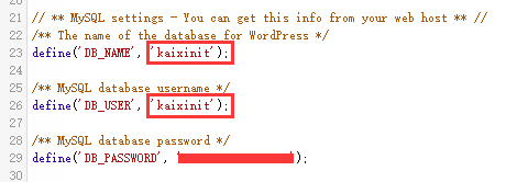 3.修改wp-config文件,把用户名、数据库名、密码修改为现在的。