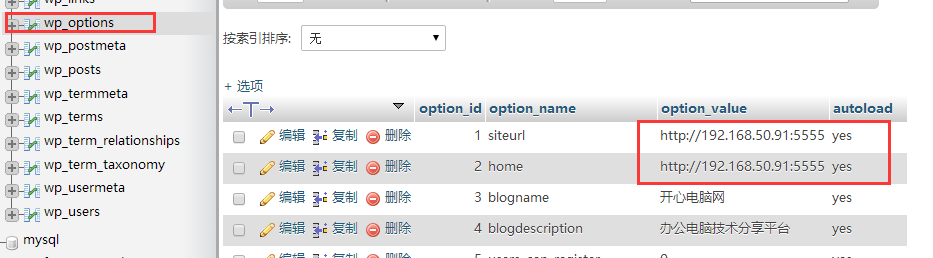 4.进入phpmyadmin,选择kaixinit数据库选择wp_options,修改siteurl和home地址,必须有http://开头的网址,即可访问。