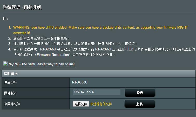 3.保持官方固件为上述最新版,在系统管理-固件升级,上传RT-AC66U_380.67_X7.6.trx固件,更新完毕后手工重启,按路由器电源开关按钮关机开机即可。