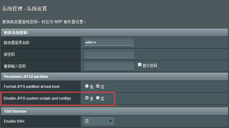 4.启用JFFS分区。具体做法:路由器后台——系统管理——系统设置,Enable JFFS custom scripts and configs 选项,选择”是“,然后点页面最下面的“应用本页面设置”,重启路由器即可。