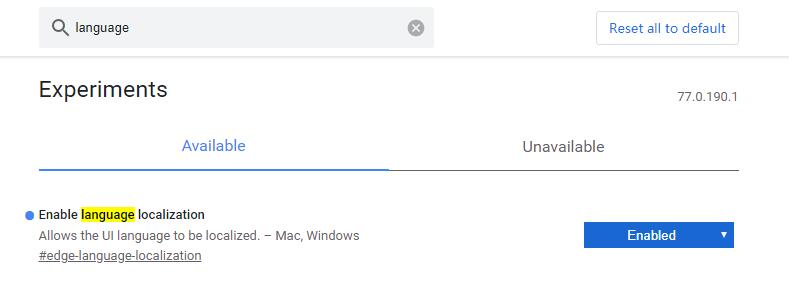2.在Chromium Edge浏览器地址栏中输入如下地址:edge://flags,在搜索框输入language,找到Enable language localization在将默认设置的Default改为Enabled,关闭浏览器重新打开浏览器。