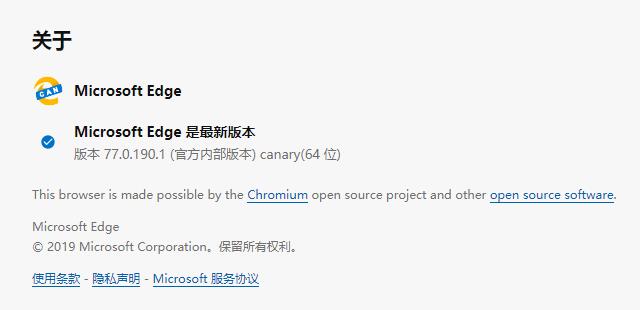 1.在Chromium Edge浏览器的地址栏中输入:edge://settings/help,让浏览器升级到最新版本例如今天的版本是:77.0.190.1