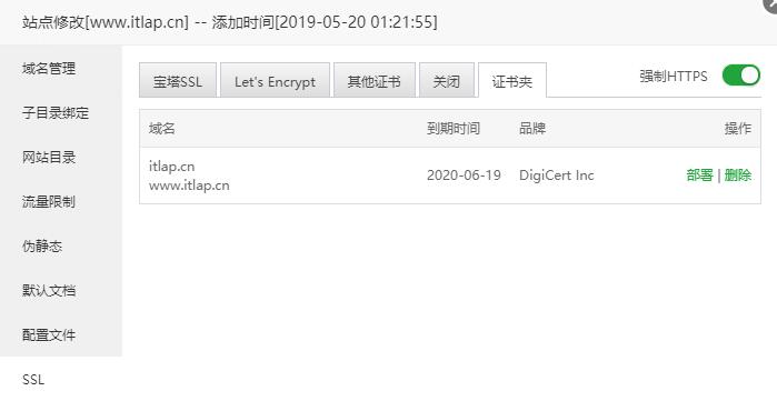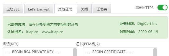 1.宝塔面板控制台设置,网站-设置-站点修改-SSL-其他证书把刚才下载的Nginx证书使用notepad编辑器打开,把密钥key和证书pem分别复制到相应框里保存,保存好以后证书夹应该会有域名成功的相关信息,然后强制https选中。
