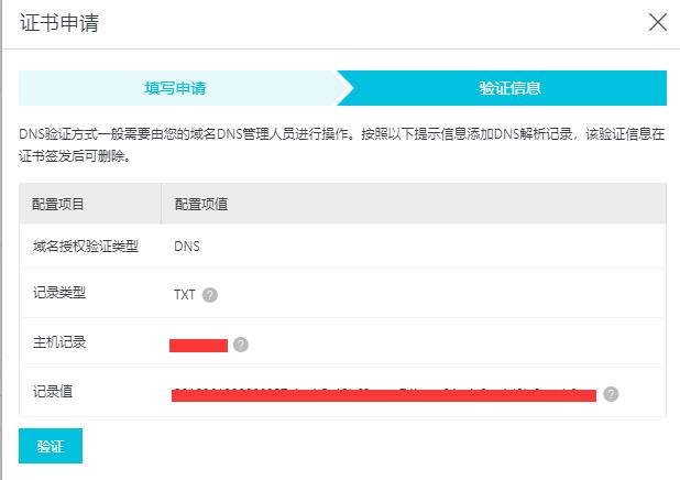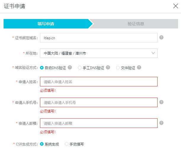 2.购买成功后进入SSL证书控制台进行部署操作,未签发栏-证书操作-申请,填入相关申请信息提交后,验证信息-验证-成功即可,因为是阿里云的同账户下域名,配置DNS属于自动验证。自动验证提交到CA公司可能也就十多分钟,之后就会收到阿里云证书下载通知说明证书已经申请成功。