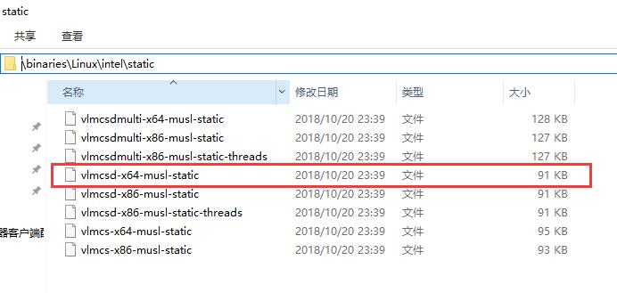 系统硬件为intel的64位cpu,所以下载成功后,解压出来binaries\Linux\intel\static\vlmcsd-x64-musl-static,将vlmcsd-x64-musl-static文件重命名为vlmcsd,