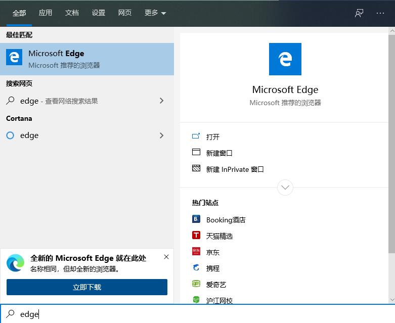Microsoft Edge 在搜索框内搜索Edge关键词,出现全新的Microsoft Edge就在此处名称相同,但确全新的浏览器,点击立即下载按钮进入下载页面。