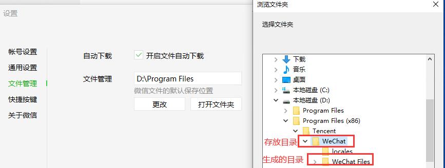 微信左下角设置>文件管理>更改如:D:\Program Files (x86)\Tencent\WeChat