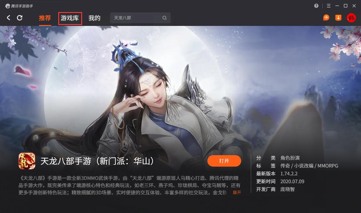 2.打开电脑端腾讯手游助手,在游戏库搜索:天龙八部,进行下载安装,安装好打开