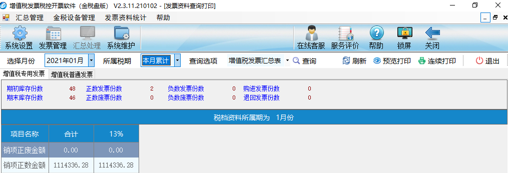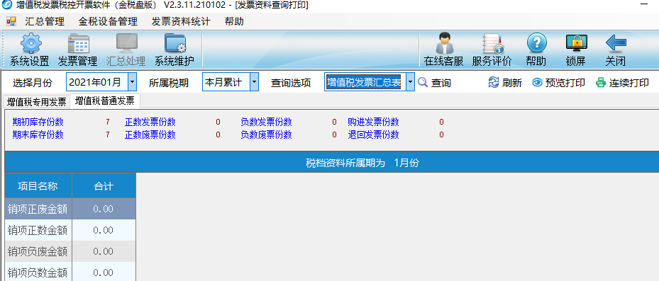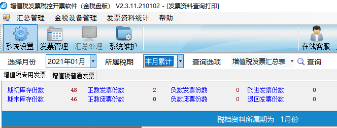 以航天金税(金税盘版)增值税发票系统开票软件操作,日期以2021年1月为例进行的发票资料抄报操作方法: