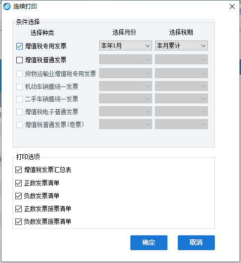 一般默认是增值税专用发票,手动选择月份:2021年1月(下拉选择),所属税期:本月累计(下拉选择),查询选项:增值税发票汇总表(默认),选择 查询,在增值税专用发票栏目下统计出开票数据(选择月份下栏)核实下和实际开票数据是否相符,相符后后,选择 连续打印,出现条件选择,对应选择:增值税专用发票,选择月份:本年1月(下拉选择),选择税期:本月累计(下拉选择),选择:确定,选择打印机【更改】选择需要的打印机后,点击 【打印按钮】即可完成。