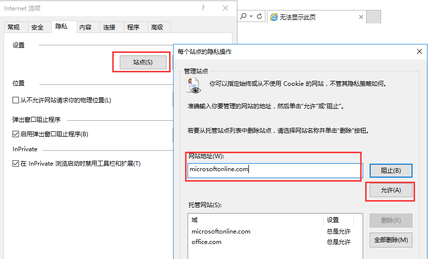 2.打开IE浏览器internet选项→隐私 →站点→网址地址添加:microsoftonline.com→允许