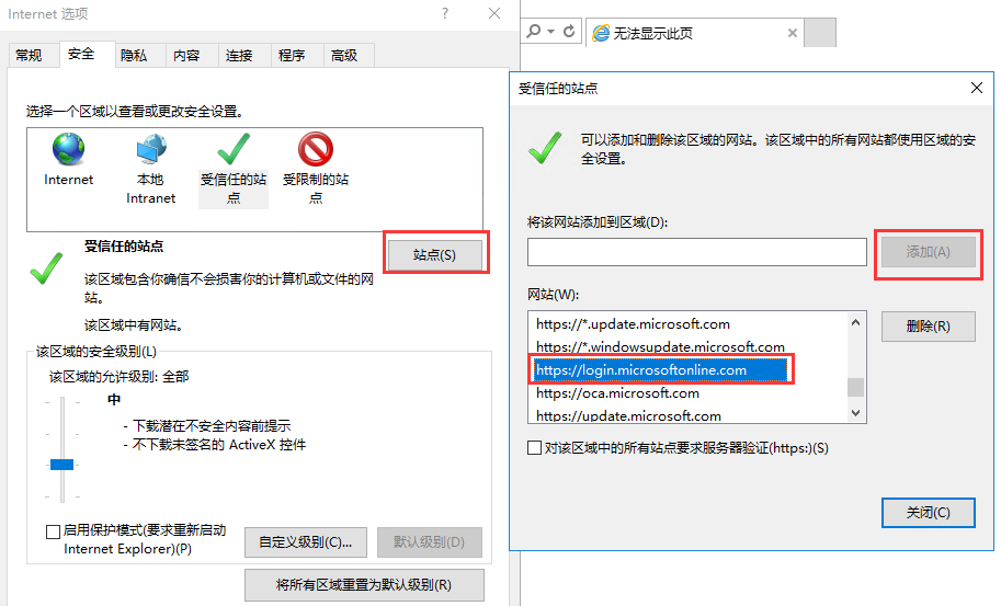 1.打开IE浏览器internet选项→安全 →受信任的站点→站点→网址地址添加:https://login.microsoftonline.com
