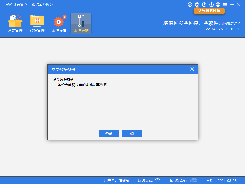 2.生成备份文件夹:系统维护→数据备份恢复(左上角)→发票数据备份→查看备份的文件夹(以税号命名的文件夹,一般在安装目录内)