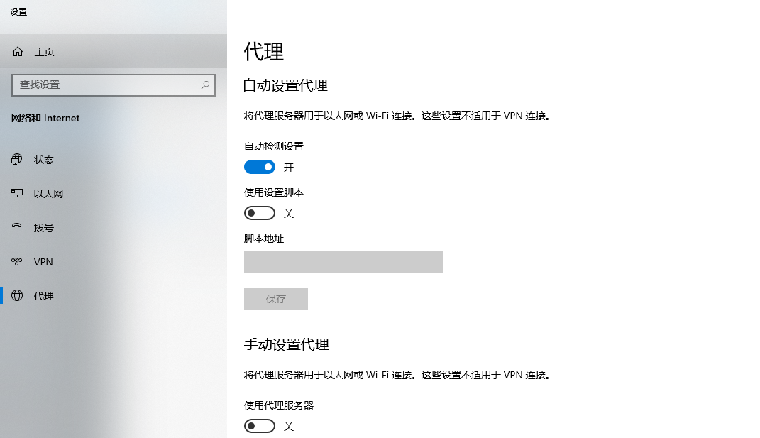 2.第一步如不行,进行网络设置,Win10的系统,开始菜单 – 设置 – 网络和Internet – 代理 – 将“使用设置脚本”和“设置代理服务器”点击关闭,打开“自动检测设置”即可。