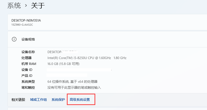 一、此电脑右键属性→系统→关于→高级系统设置,如下图红色标注处