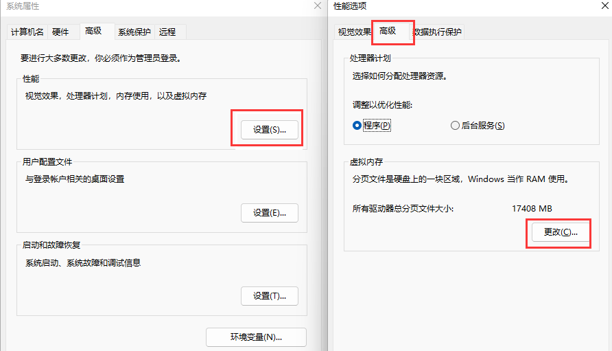 二、高级→性能→设置,高级→程序→更改,如下图红色标注处