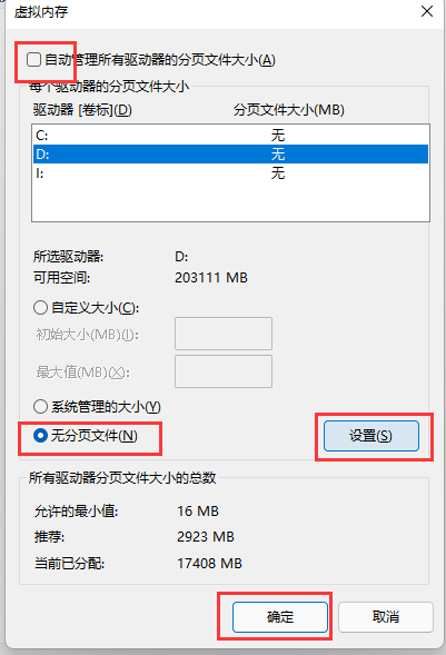 三、自动管理所有驱动器的分页大小去掉√,选中D盘,选中 无分页文件→设置→确定,然后电脑重启后就可正常设置。如下图红色标注处