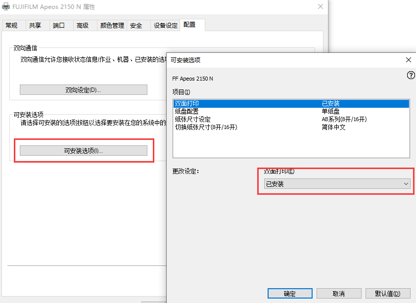 1.控制面板\硬件和声音\设备和打印机\FUJIFILM Apeos 2150 N右键 打印机属性→配置→可安装选项→双面打印→更改设定:已安装→确定。