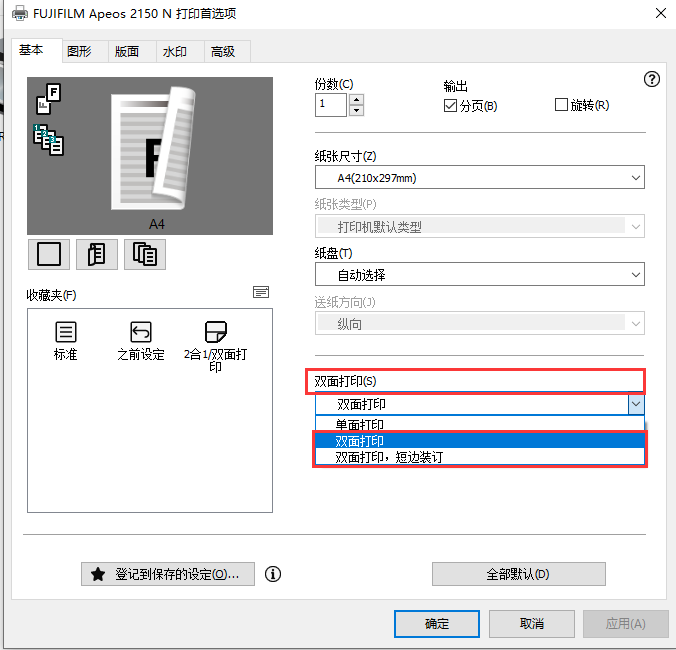 2.控制面板\硬件和声音\设备和打印机\FUJIFILM Apeos 2150 N右键 打印机选项→基本→双面打印→更改:双面打印→确定。